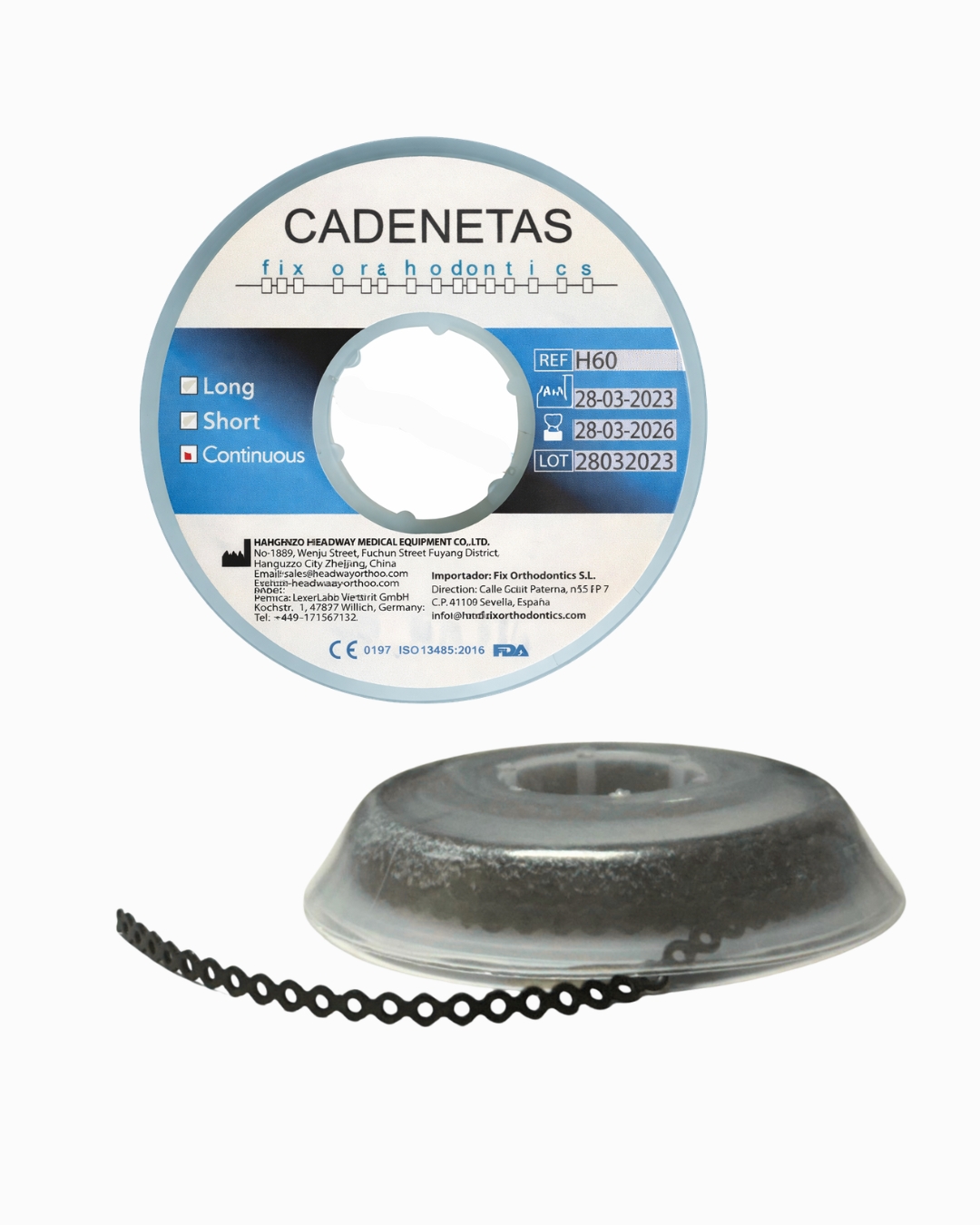 La Cadeneta FIX Negra es un elástico intraoral fabricado con poliuretano médico de alta resistencia, diseñado para el cierre de espacios, mantenimiento de posición y control de rotaciones en tratamientos de ortodoncia.
